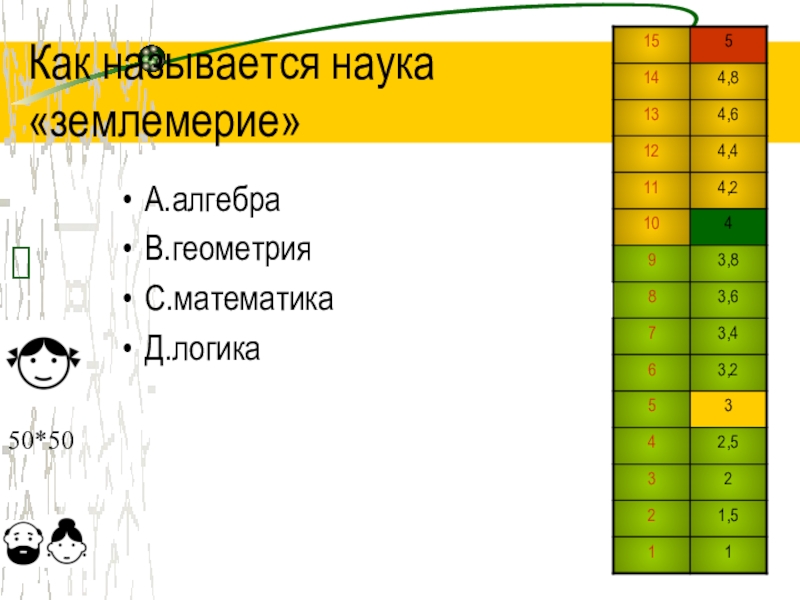 Как называется наука  «землемерие»А.алгебраВ.геометрияС.математикаД.логика?50*50