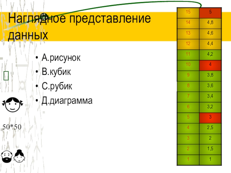 Наглядное представление  данныхА.рисунокВ.кубикС.рубикД.диаграмма?50*50