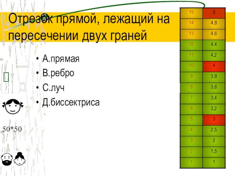 Отрезок прямой, лежащий на пересечении двух гранейА.прямаяВ.реброС.лучД.биссектриса?50*50