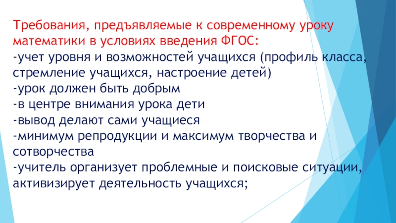 Слайд 14Требования, предъявляемые к современному уроку математики в условиях введения ФГОС: