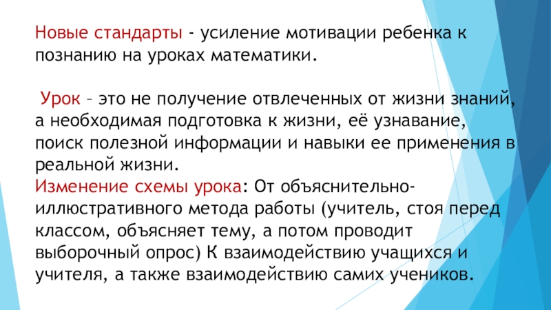 Слайд 16Новые стандарты - усиление мотивации ребенка к познанию на уроках математики.