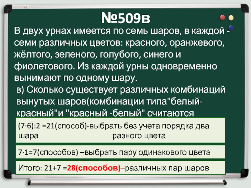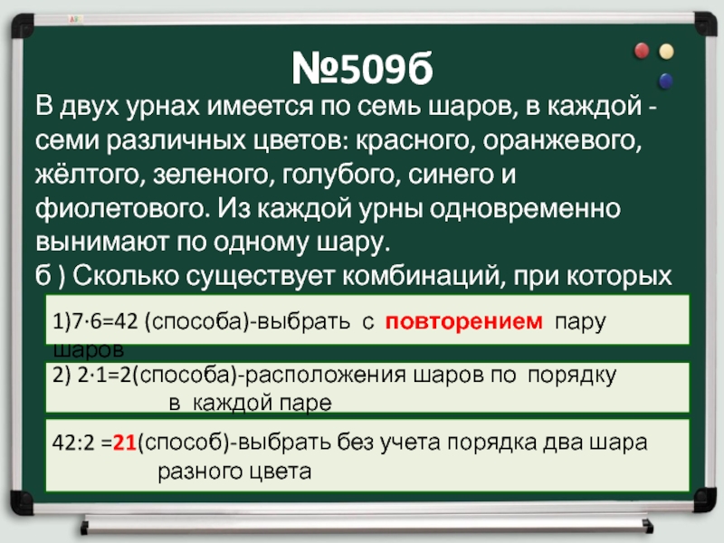(7∙6):2 =21(способ)-выбрать без учета порядка два шара разного цвета