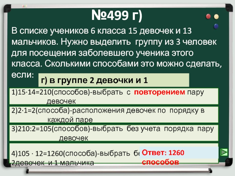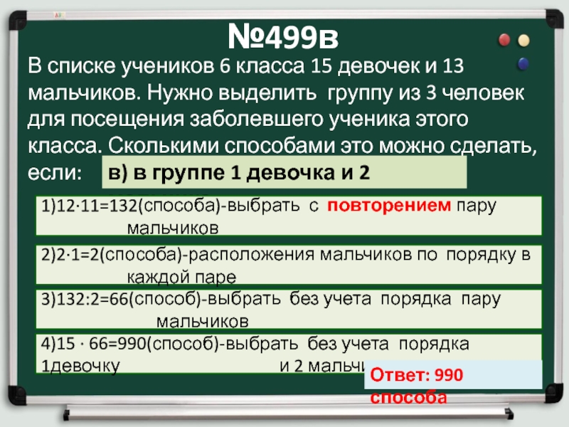 4)15 ∙ 66=990(способ)-выбрать без учета порядка 1девочку и 2 мальчиков