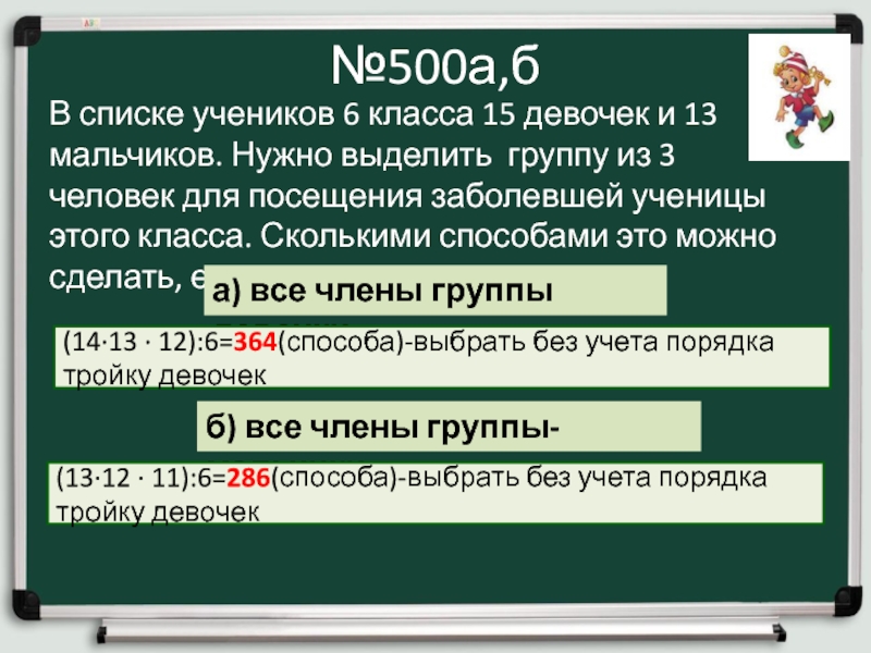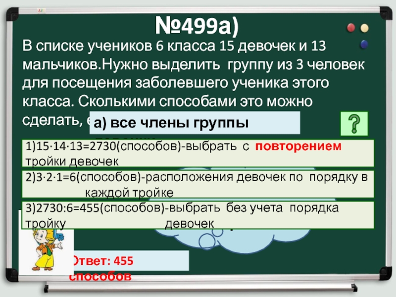 3)2730:6=455(способов)-выбрать без учета порядка тройку девочек