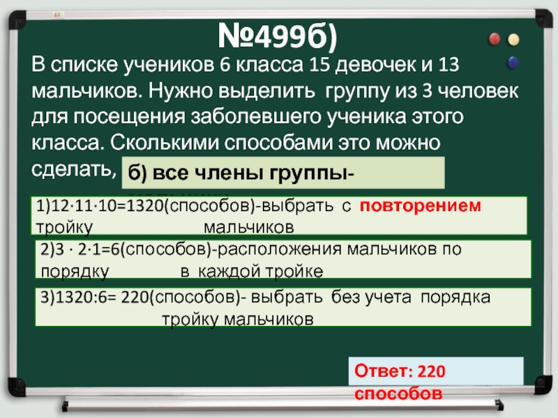 3)1320:6= 220(способов)- выбрать без учета порядка тройку мальчиков
