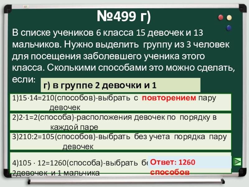 4)15 ∙ 66=990(способ)-выбрать без учета порядка 1девочку и 2 мальчиков