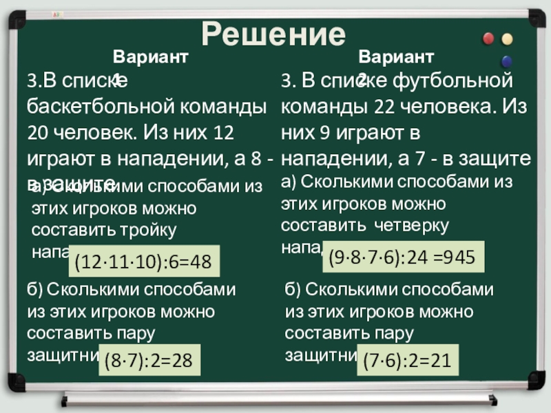 3. В списке футбольной команды 22 человека. Из них 9 играют в нападении, а 7 - в защите