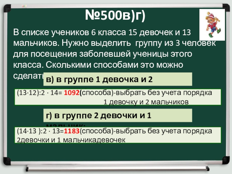 (14∙13 ):2 ∙ 13=1183(способа)-выбрать без учета порядка 2девочки и 1 мальчикадевочек