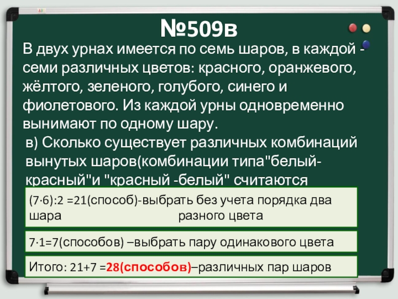 (7∙6):2 =21(способ)-выбрать без учета порядка два шара разного цвета