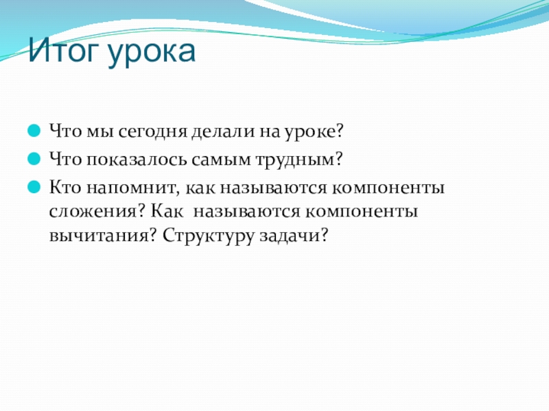 Итог урока Что мы сегодня делали на уроке?Что показалось самым трудным?Кто напомнит, как называются компоненты сложения? Как