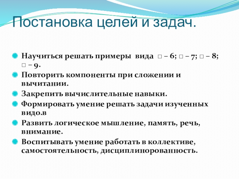 Постановка целей и задач. Научиться решать примеры вида □ – 6; □ – 7; □ – 8;