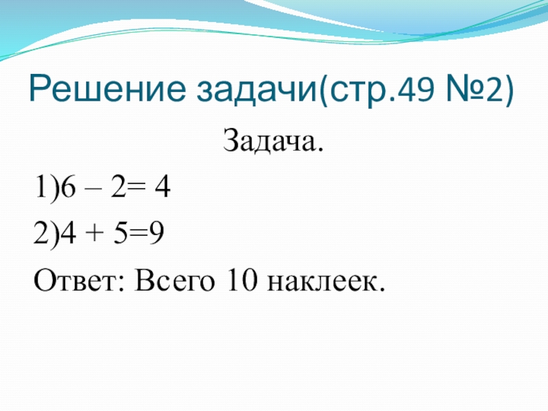 Решение задачи(стр.49 №2)Задача.1)6 – 2= 42)4 + 5=9Ответ: Всего 10 наклеек.