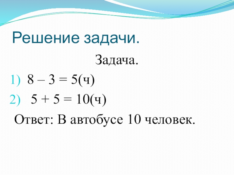Решение задачи.Задача.8 – 3 = 5(ч) 5 + 5 = 10(ч)Ответ: В автобусе 10 человек.