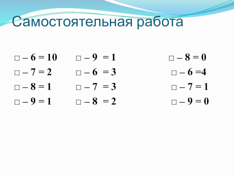 Самостоятельная работа □ – 6 = 10    □ – 9 = 1