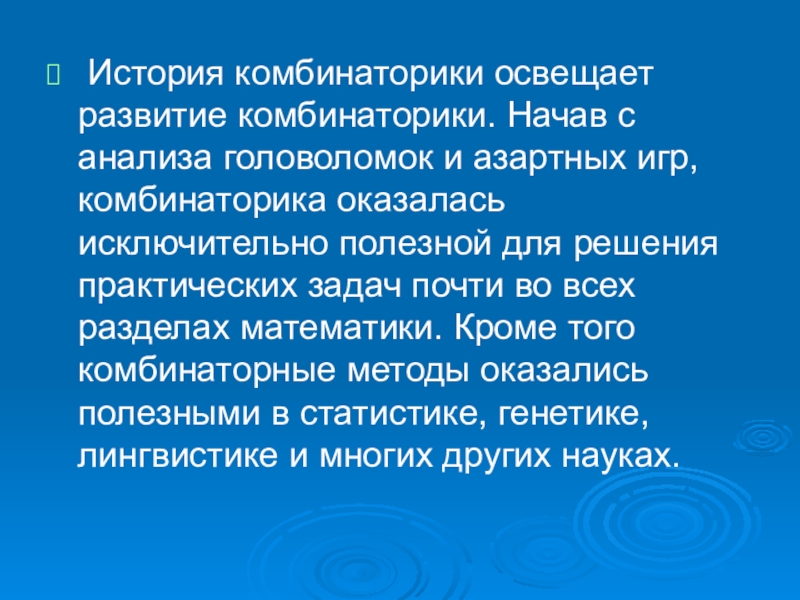 азартных игр, комбинаторика оказалась исключительно полезной для решения практических задач почти во всех разделах математики. Кроме того комбинаторные методы оказались полезными в статистике, генетике, лингвистике и многих других науках.