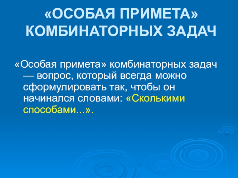Слайд 12«ОСОБАЯ ПРИМЕТА» КОМБИНАТОРНЫХ ЗАДАЧ
