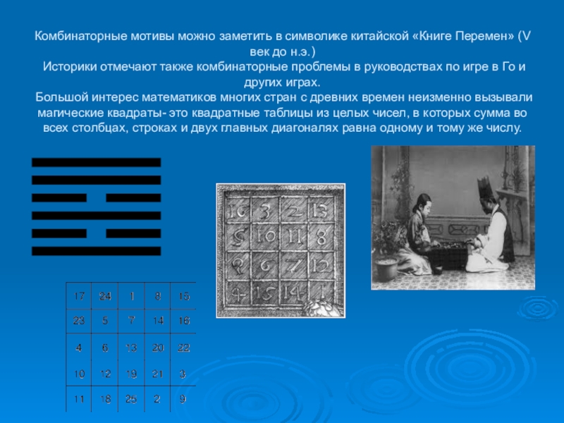 Слайд 9Комбинаторные мотивы можно заметить в символике китайской «Книге Перемен» (V век