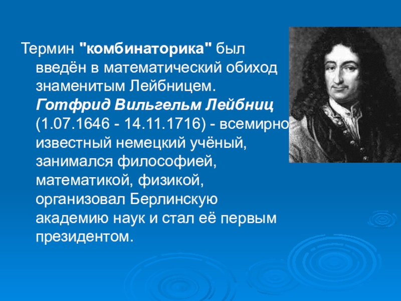 Слайд 10Термин "комбинаторика" был введён в математический обиход знаменитым Лейбницем.