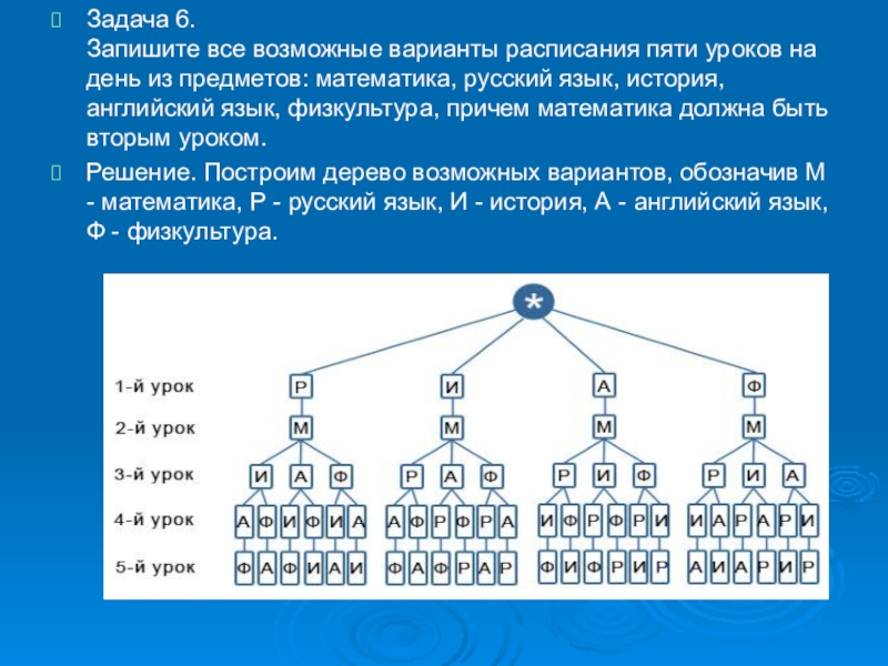 Решение. Построим дерево возможных вариантов, обозначив М - математика, Р - русский язык, И - история, А - английский язык, Ф - физкультура.