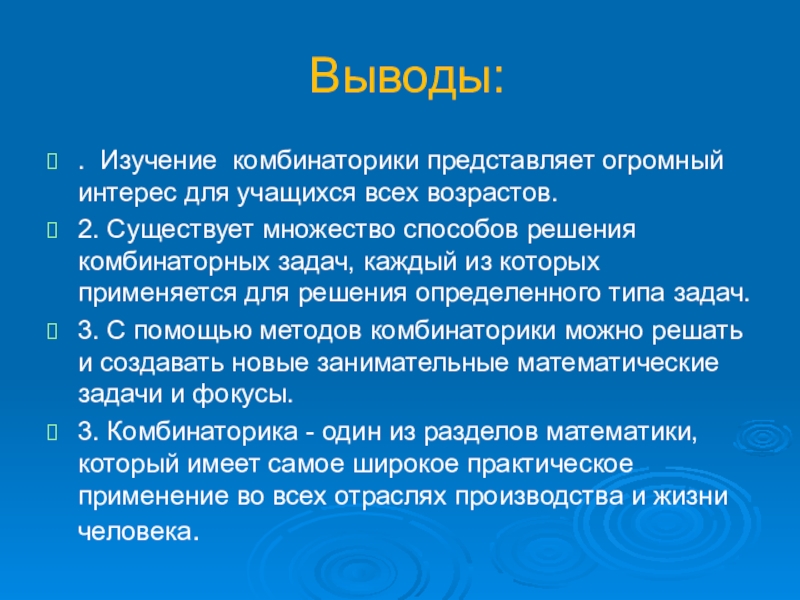 3. С помощью методов комбинаторики можно решать и создавать новые занимательные математические задачи и фокусы.