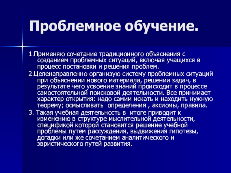 2.Целенаправленно организую систему проблемных ситуаций при объяснении нового материала, решении задач, в результате чего усвоение знаний происходит в процессе самостоятельной поисковой деятельности. Все принимает характер открытия: надо самим искать и находить нужную теорему; осмысливать определения , аксиомы, правила.