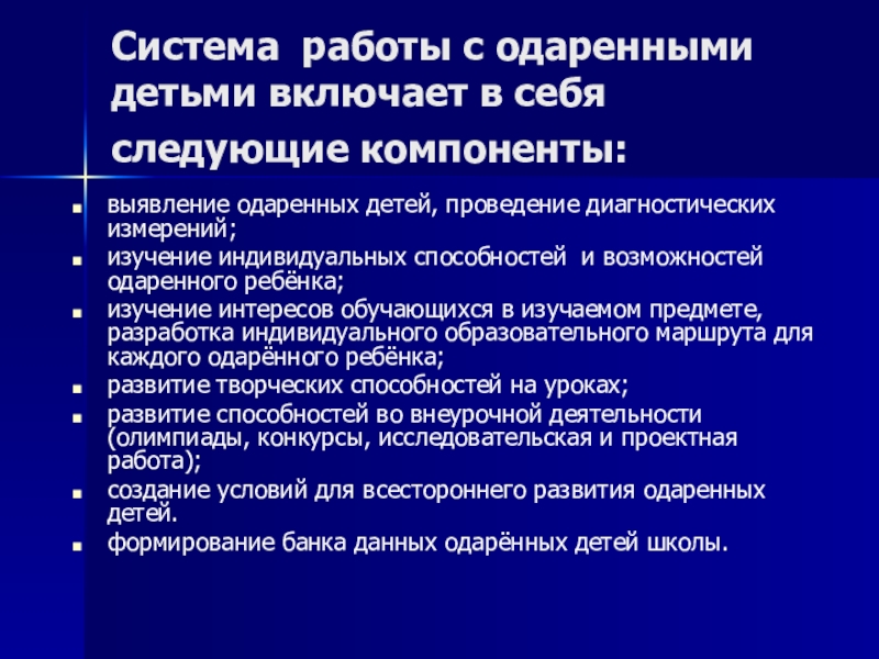 Слайд 3Система работы с одаренными детьми включает в себя следующие компоненты: