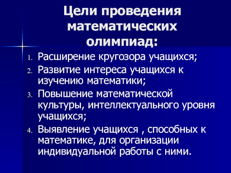 Выявление учащихся , способных к математике, для организации индивидуальной работы с ними.