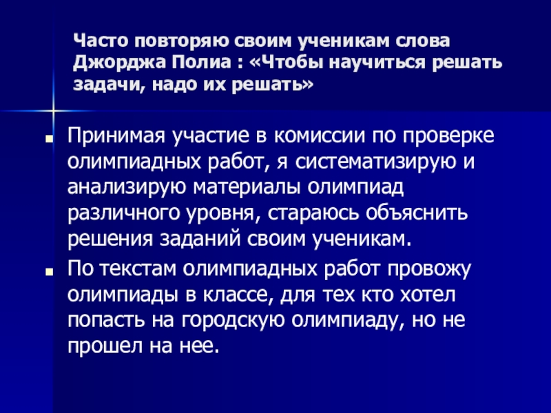 Слайд 17Часто повторяю своим ученикам слова Джорджа Полиа : «Чтобы научиться решать