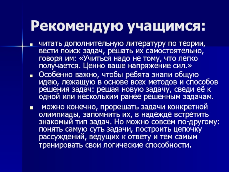 самостоятельно, говоря им: «Учиться надо не тому, что легко получается. Ценно ваше напряжение сил.»