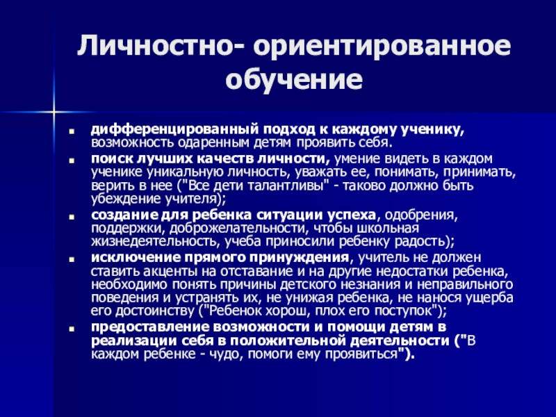 поиск лучших качеств личности, умение видеть в каждом ученике уникальную личность, уважать ее, понимать, принимать, верить в нее ("Все дети талантливы" - таково должно быть убеждение учителя);