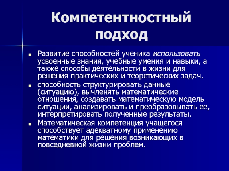 Математическая компетенция учащегося способствует адекватному применению математики для решения возникающих в повседневной жизни проблем.