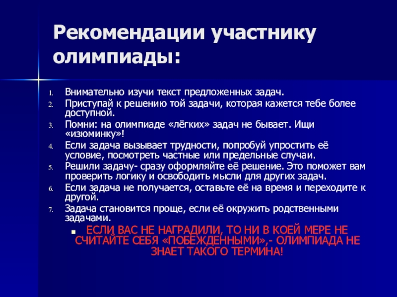 ЕСЛИ ВАС НЕ НАГРАДИЛИ, ТО НИ В КОЕЙ МЕРЕ НЕ СЧИТАЙТЕ СЕБЯ «ПОБЕЖДЕННЫМИ»,- ОЛИМПИАДА НЕ ЗНАЕТ ТАКОГО ТЕРМИНА!
