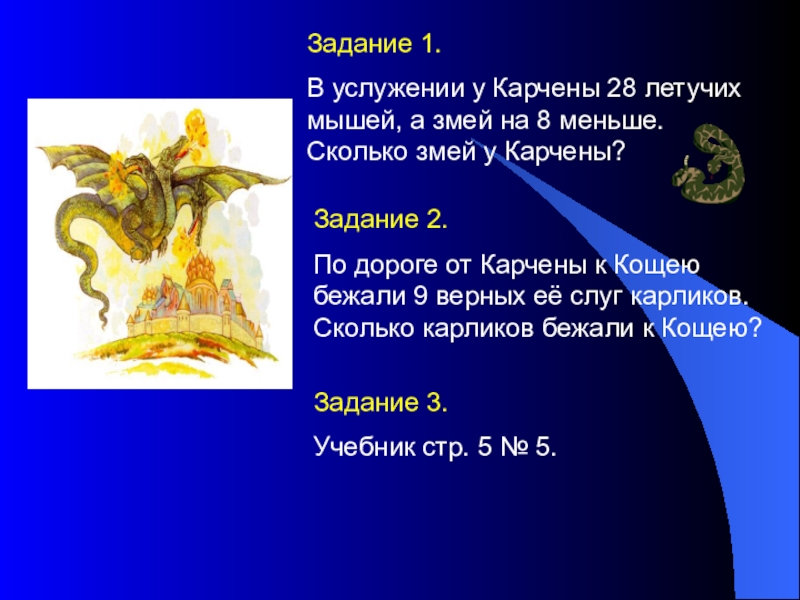 По дороге от Карчены к Кощею бежали 9 верных её слуг карликов. Сколько карликов бежали к Кощею?