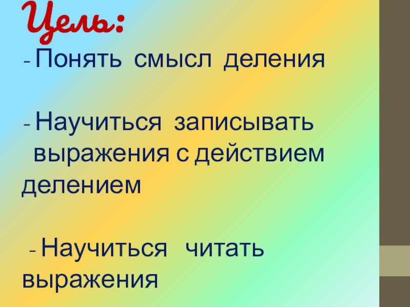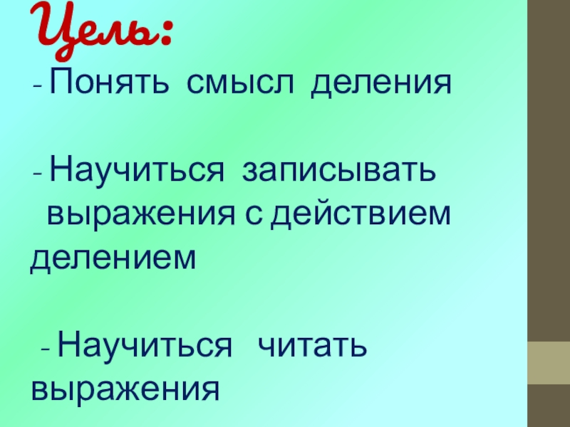 Слайд 5Цель: - Понять смысл деления - Научиться записывать выражения с действием делением