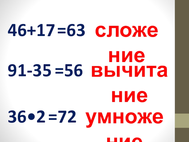 91-3546+1736•2=63=56=72сложениевычитаниеумножение