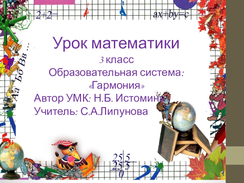 Урок математики3 классОбразовательная система: «Гармония»Автор УМК: Н.Б. ИстоминаУчитель: С.А.Липунова