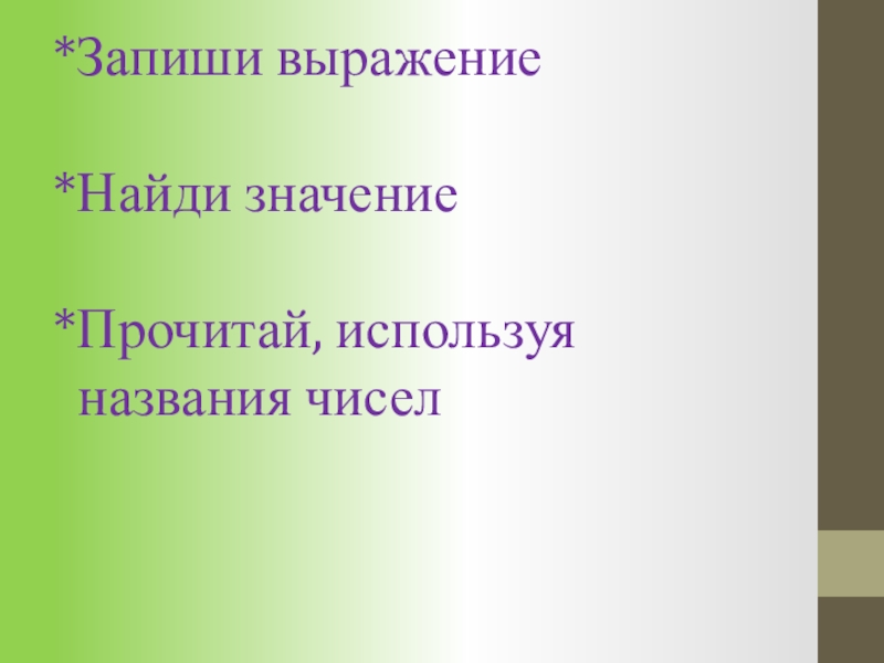 Слайд 2*Запиши выражение *Найди значение *Прочитай, используя названия чисел