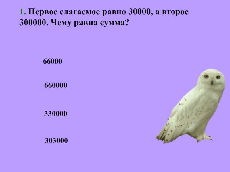 1. Первое слагаемое равно 30000, а второе 300000. Чему равна сумма? 66000660000330000303000