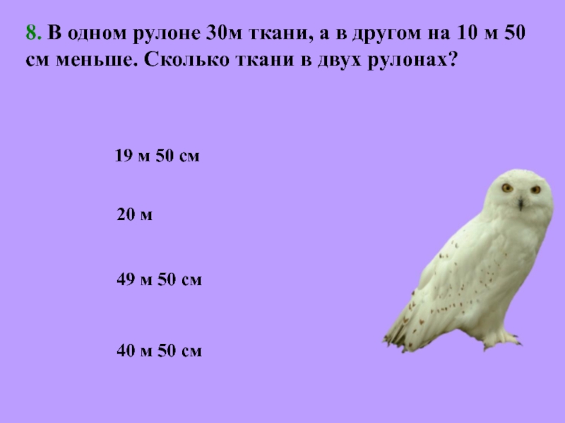 8. В одном рулоне 30м ткани, а в другом на 10 м 50 см меньше. Сколько ткани