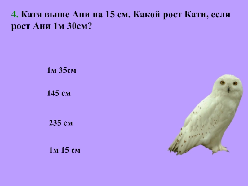 4. Катя выше Ани на 15 см. Какой рост Кати, если рост Ани 1м 30см? 235 см145