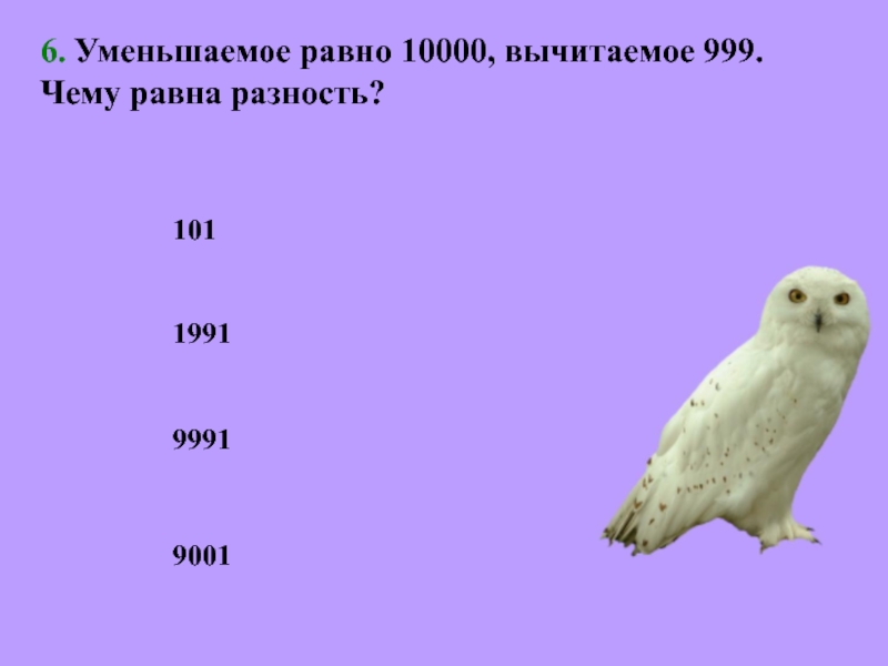 6. Уменьшаемое равно 10000, вычитаемое 999. Чему равна разность?101199199919001