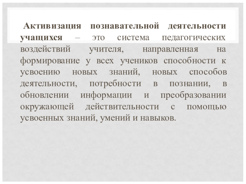 Слайд 4 Активизация познавательной деятельности учащихся – это система педагогических воздействий учителя, направленная