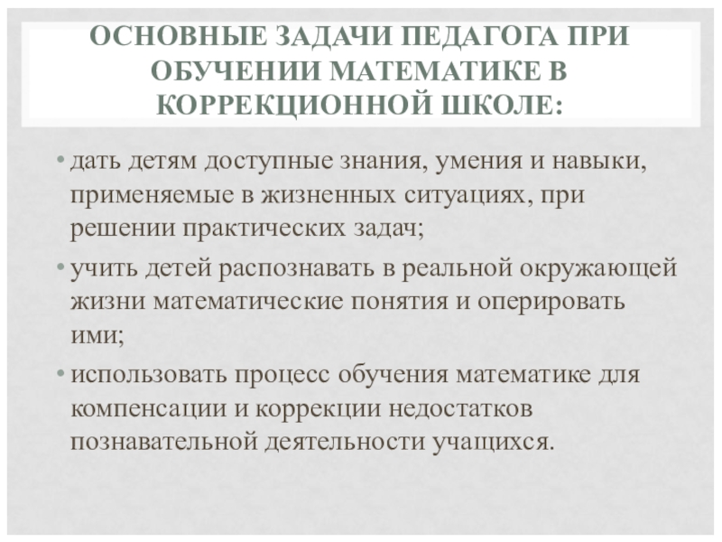 ОСНОВНЫЕ ЗАДАЧИ ПЕДАГОГА ПРИ ОБУЧЕНИИ МАТЕМАТИКЕ В КОРРЕКЦИОННОЙ ШКОЛЕ: