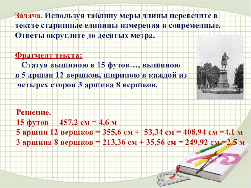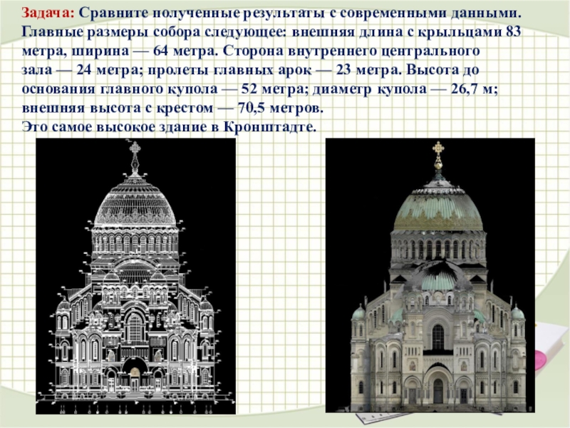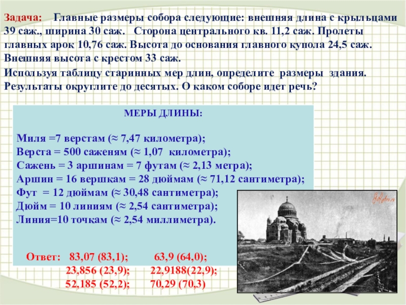 Используя таблицу старинных мер длин, определите размеры здания. Результаты округлите до десятых. О каком соборе идет речь?