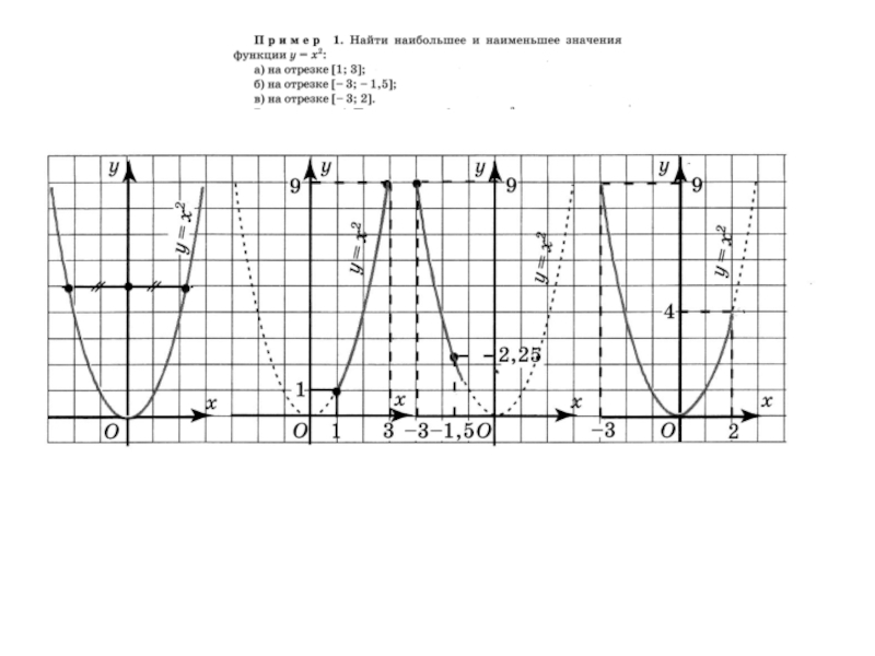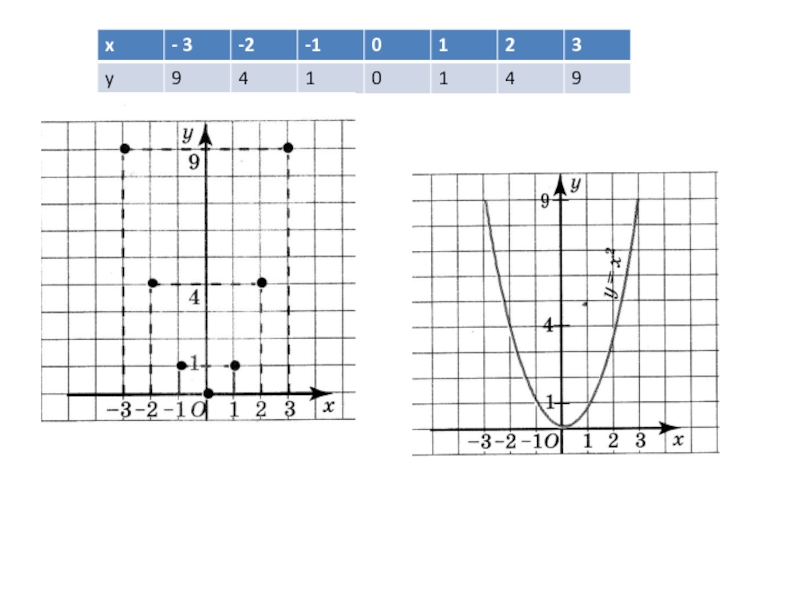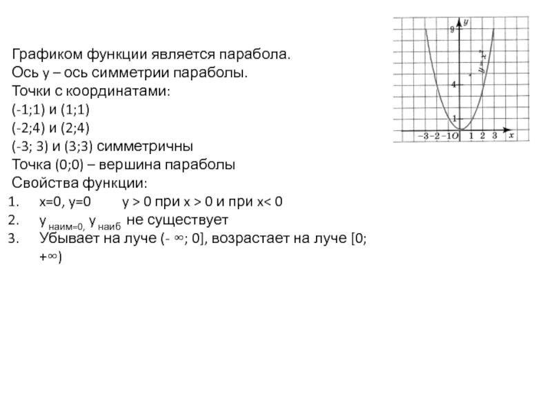 Графиком функции является парабола.Ось y – ось симметрии параболы.Точки с координатами:(-1;1) и (1;1)(-2;4) и (2;4)(-3; 3) и