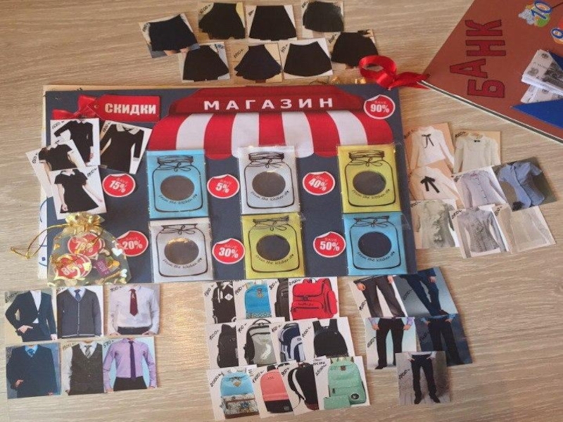 форма. В шести конвертах разные элементы формы: брюки, юбки, блузки, пиджаки, ранцы, платья с написан-ными на них ценами. Слева от кармашков-магниты, куда прикрепляются скидки на товар (скидки в кармашке). Ребята подбирают себе комплект одежды и подсчитывают, какую скидку они получат , находят цену их школьной формы и количество сэкономленных денег. В нашей школе форма есть, поэтому задача актуальна, и что самое главное, имеет много решений, т.к. скидки и комплекты формы вариативны.