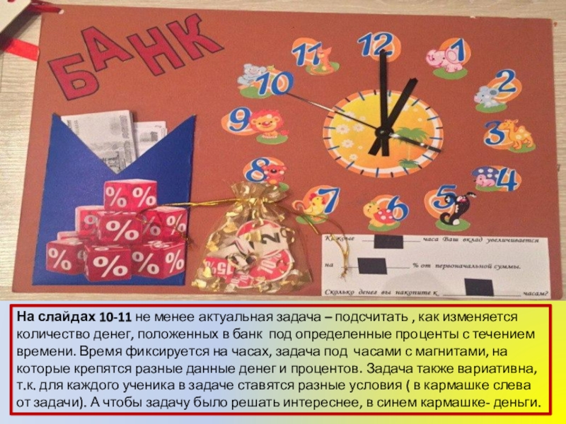изменяется количество денег, положенных в банк под определенные проценты с течением времени. Время фиксируется на часах, задача под часами с магнитами, на которые крепятся разные данные денег и процентов. Задача также вариативна, т.к. для каждого ученика в задаче ставятся разные условия ( в кармашке слева от задачи). А чтобы задачу было решать интереснее, в синем кармашке- деньги.