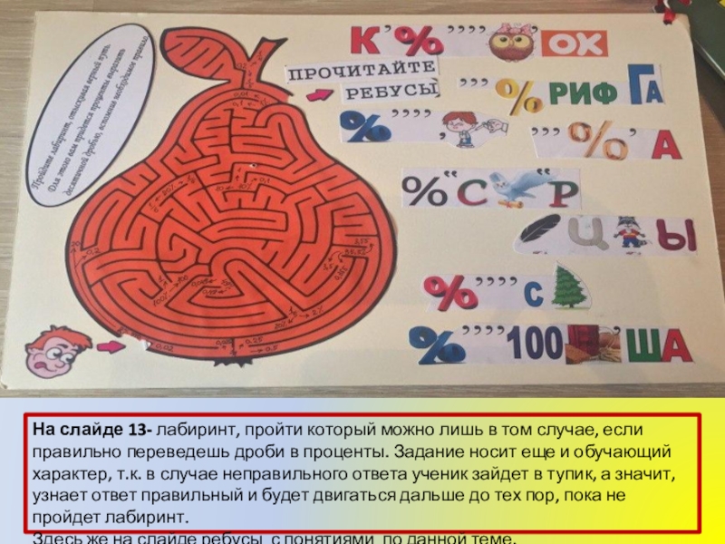 если правильно переведешь дроби в проценты. Задание носит еще и обучающий характер, т.к. в случае неправильного ответа ученик зайдет в тупик, а значит, узнает ответ правильный и будет двигаться дальше до тех пор, пока не пройдет лабиринт.
