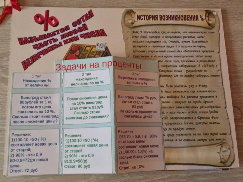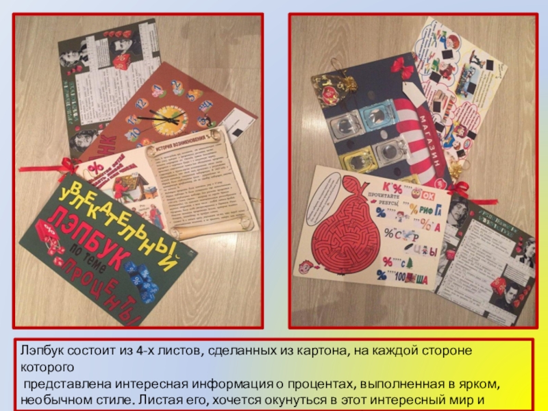 представлена интересная информация о процентах, выполненная в ярком, необычном стиле. Листая его, хочется окунуться в этот интересный мир и совершить путешествие по красивым страницам лэпбука