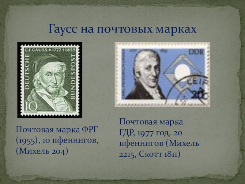 Гаусс на почтовых маркахПочтовая марка ФРГ (1955), 10 пфеннигов, (Михель 204)Почтовая марка ГДР, 1977 год, 20